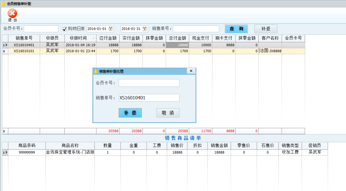 点击“11-会员补登”进入,有时在销售单据的时候 ,忘记输入会员,从而后面要补录会员信息到对应的单据。