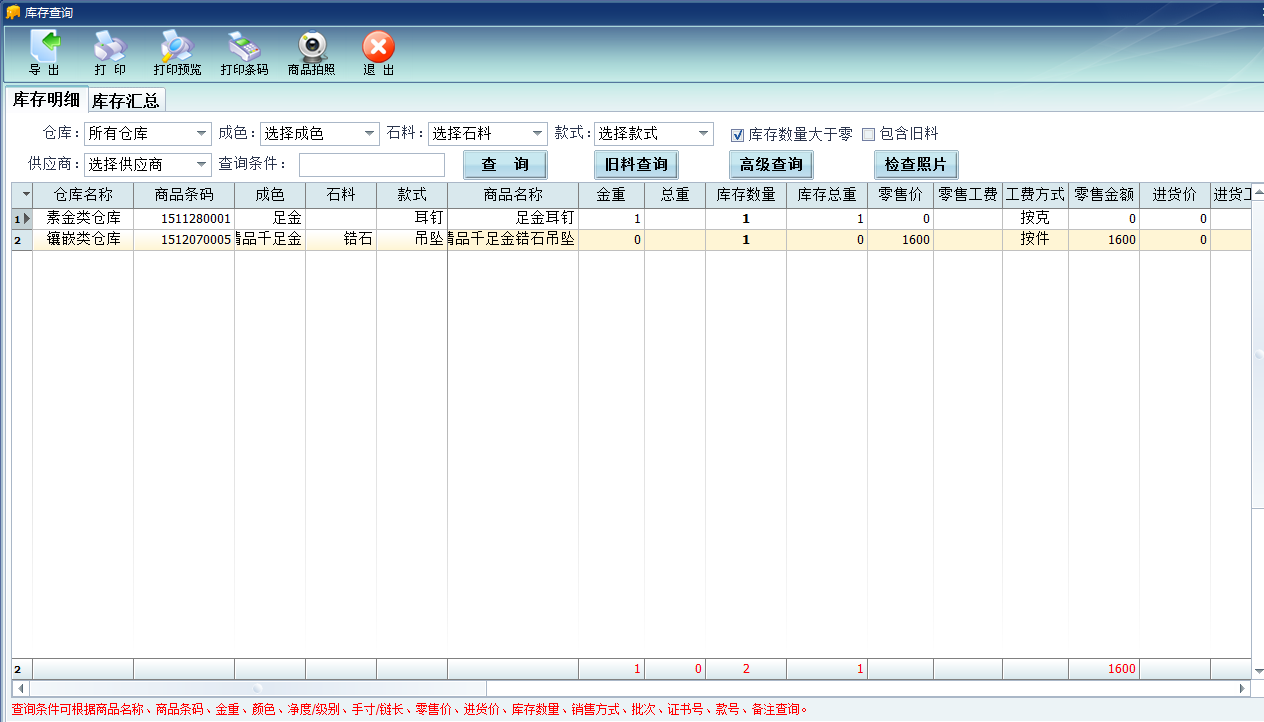 我们可以选择查询条件:仓库,成色,石料,款式,供应商,商品条码,商品名称等商品信息对商品库存进行查询。同时也可以使用高级查询(可对多个成色,石料,款式组合查询)高级查询(高级查询使用方法)。