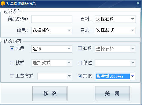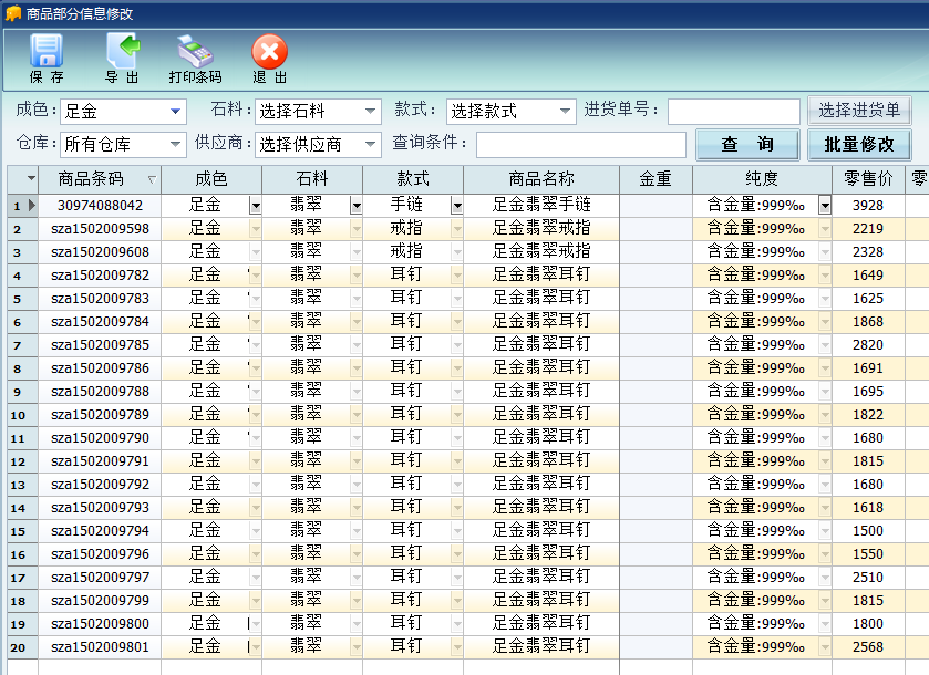 1.选择根据查询条件,查询出要修改的商品(注意一定要查询出要修改的商品,同时查询出来的商品都是统一修改同样的信息)如下图查询 出所有仓库中成色我足金的商品进行内容修改。
