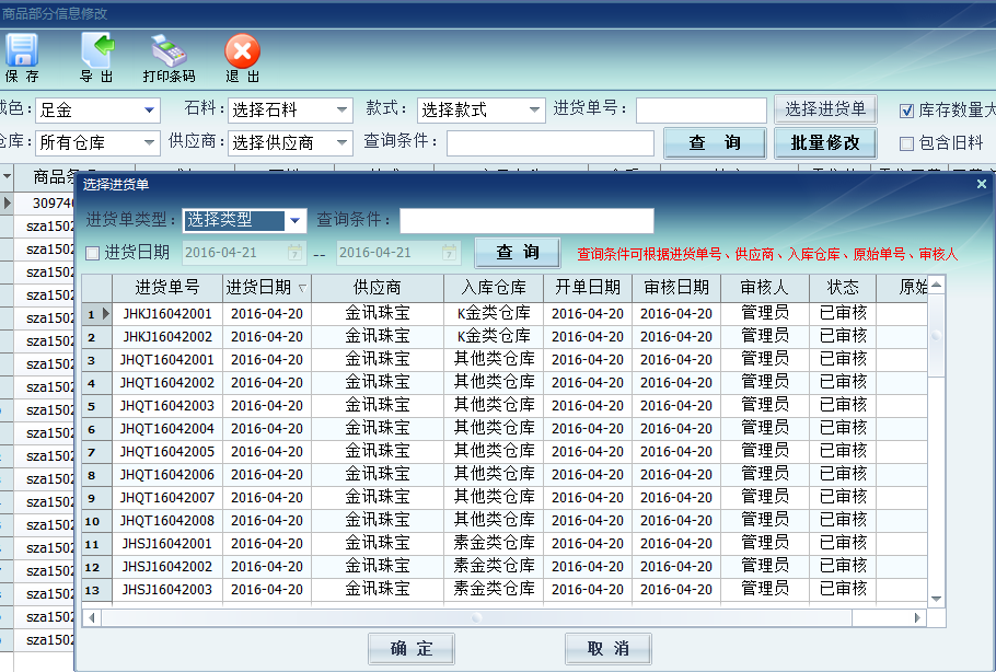 查询条件包括:成色,石料,款式,仓库,进货单号等。根据实际情况进行选择